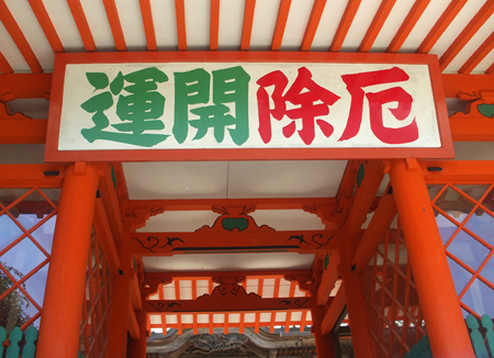 厄除開運」の看板のかかった仁王門から階段を下りていくようです。