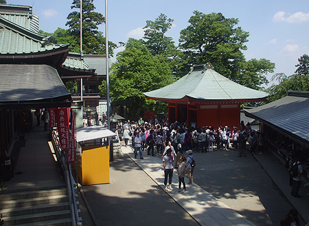 左が本堂、右がお札売り場。人だかりの中にナンノさん。