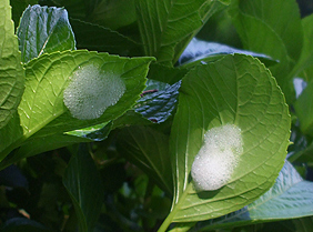 アジサイの葉っぱにアワフキムシがいた。誰かが台所洗剤を使ってアワをとばしたわけではなく、このアブクの中に虫の幼虫が暮らしております。