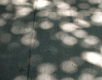 帰り道、午後の地面。木漏れ日がアニメ絵みたいに丸いよ。