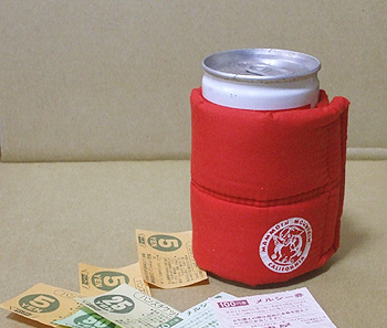 赤い胴巻きみたいのは、缶に巻く保温用品らしい。これが売れなかったであろう理由はわかる。
